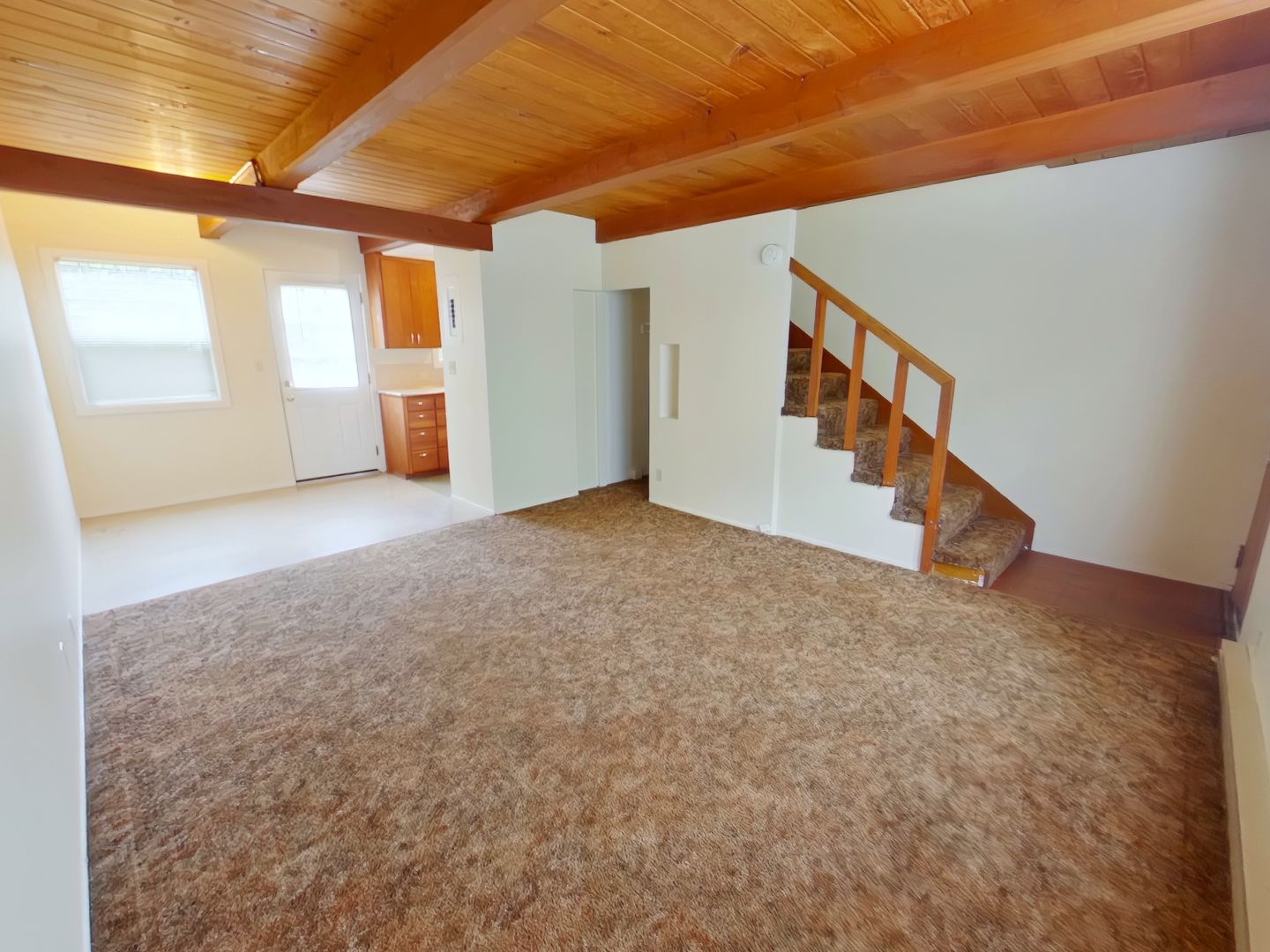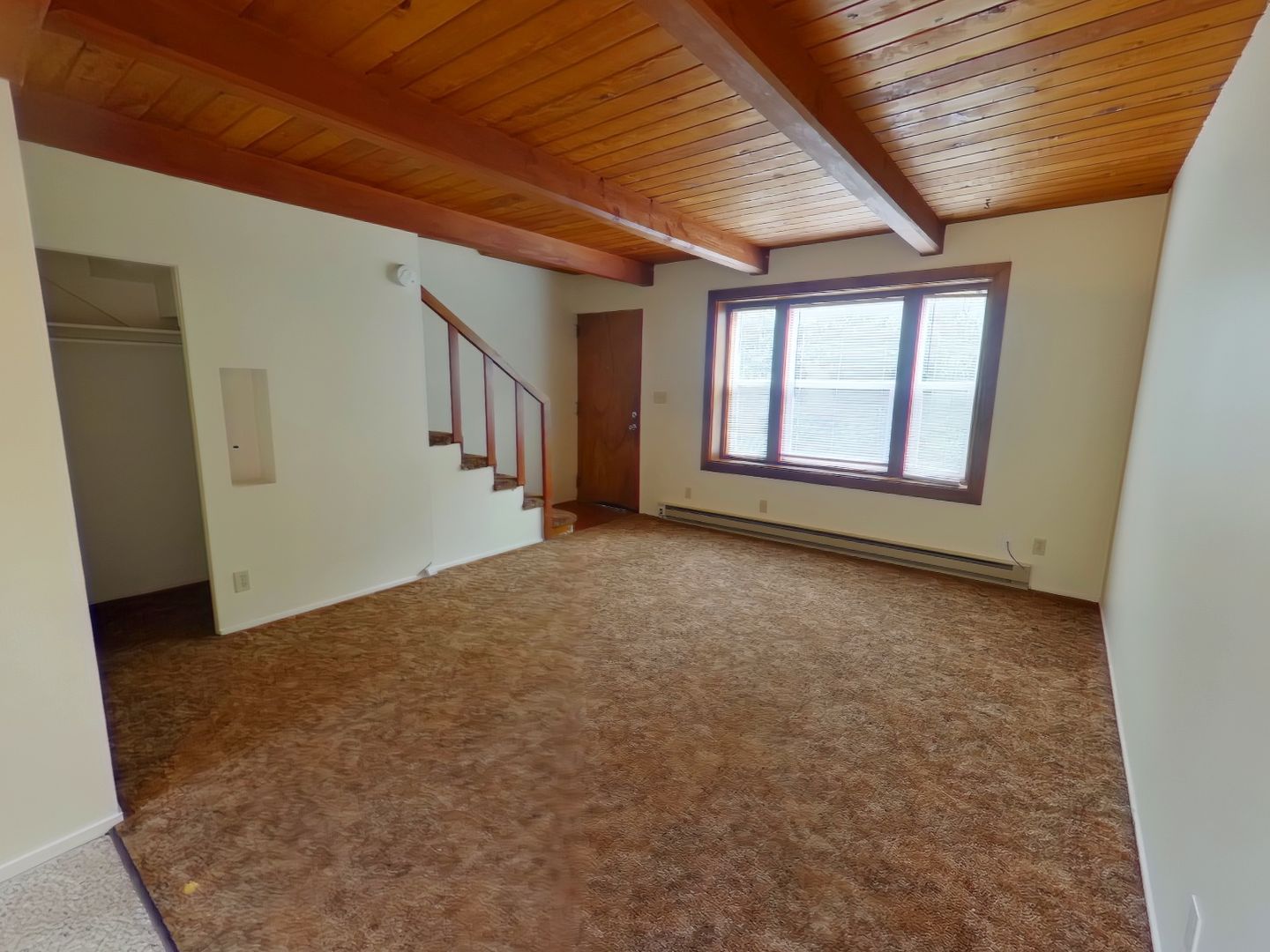 Onyx Apartments! This charming 2 bedroom, 1 bath townhouse style unit features kitchen appliances, small area in kitchen for table, nice layout, newer vinyl windows with wood beamed ceiling in living space, carpet and window coverings, bathroom is located upstairs, small front/back porch area. Near campus,, Hayward Field bus line, coffee shops, shopping. An onsite laundry room makes living at this property convenient!