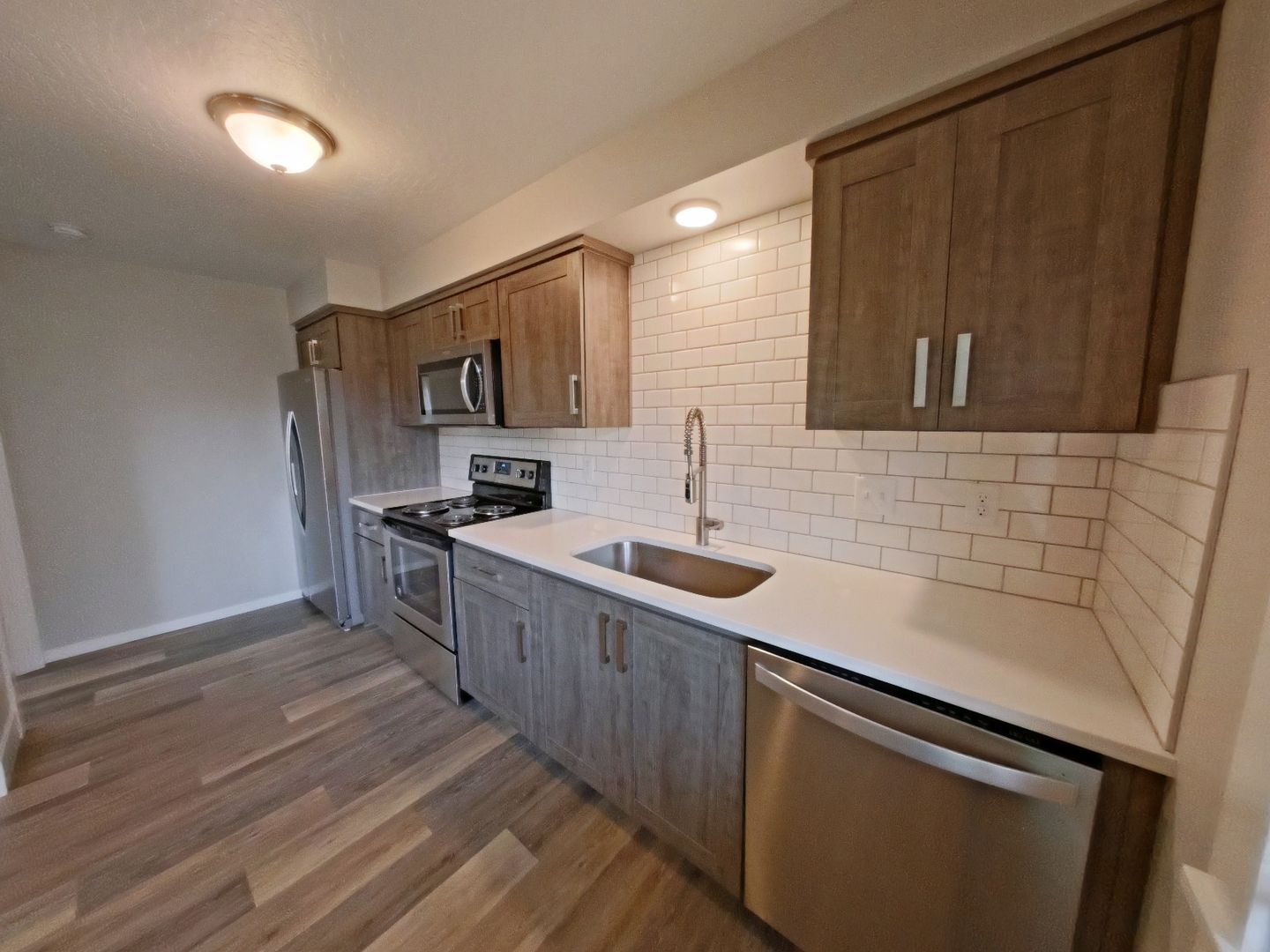 Completely remodeled, top floor unit. Just a few blocks from campus! Each unit has its own washer/dryer. Beautiful vinyl plank flooring throughout living room and kitchen and new carpet in the bedrooms. Remodeled kitchen features new black cabinets with stainless steel appliances, including dishwasher, microwave and garbage disposal.